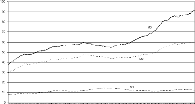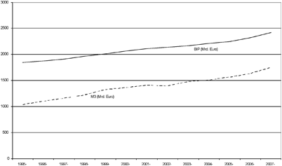 Abbildung 1: Entwicklung der Geldmenge (M3) im Vergleich zum nominellen BIP (jeweils in Mrd. Euro) – jeweils für Deutschland 1995-2007