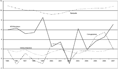 Abbildung 2: Komponenten der Inflation (Geldmengenwachstum, Erzeuger- und Verbraucherpreise, Sparquote) – jeweils für Deutschland 1995-2007