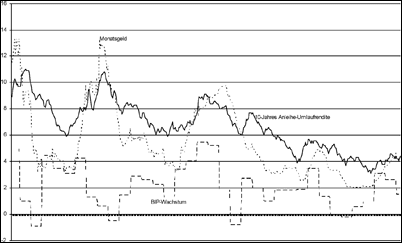 Abbildung 3: Vergleich langfristiger und kurzfristiger Zinsen mit dem Konjunkturverlauf – Deutschland 1973-2008