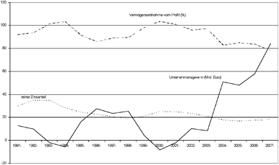 Abbildung 4: Aufteilung des Bruttoprofits in Vermögensentnahme, Zins und Unternehmensgewinn bei Nicht-finanziellen Kapitalgesellschaften – Deutschland 1991-2007