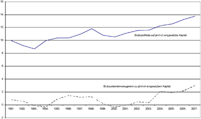 Abbildung 5: Entwicklung der Bruttoprofitrate im Gegensatz zur Gewinnprofitrate von Nicht-Finanziellen Kapitalgesellschaften – Deutschland 1991-2007
