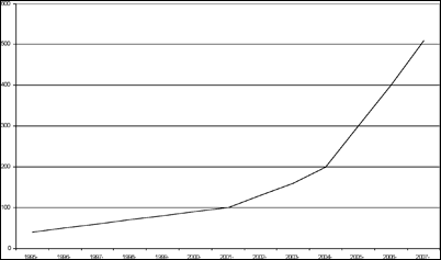 Abbildung 7: Entwicklung des Werts von ausstehenden Kontrakten auf den Derivatenmärkten (in Billiarden USD) – 1995-2007