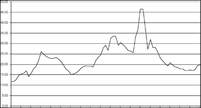 Abbildung 8: Entwicklung des Kurs-Gewinn-Verhältnisses der Aktien des S&P 500 – 1986-2007