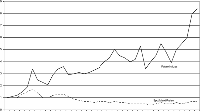 Abbildung 9: Relative Entwicklung der Preisindizes auf Spot-Märkten und derjenigen auf Commodity-Future-Märkten